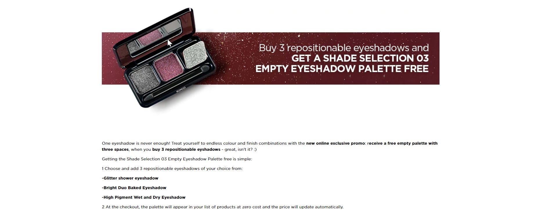 2 برابر در یک بازه زمانی محدود (18 تا 21 ژانویه 2018) فقط به صورت آنلاین و هم در مغازه ها فقط به کاربران موجود برنامه KIKO Rewards داده می شد.