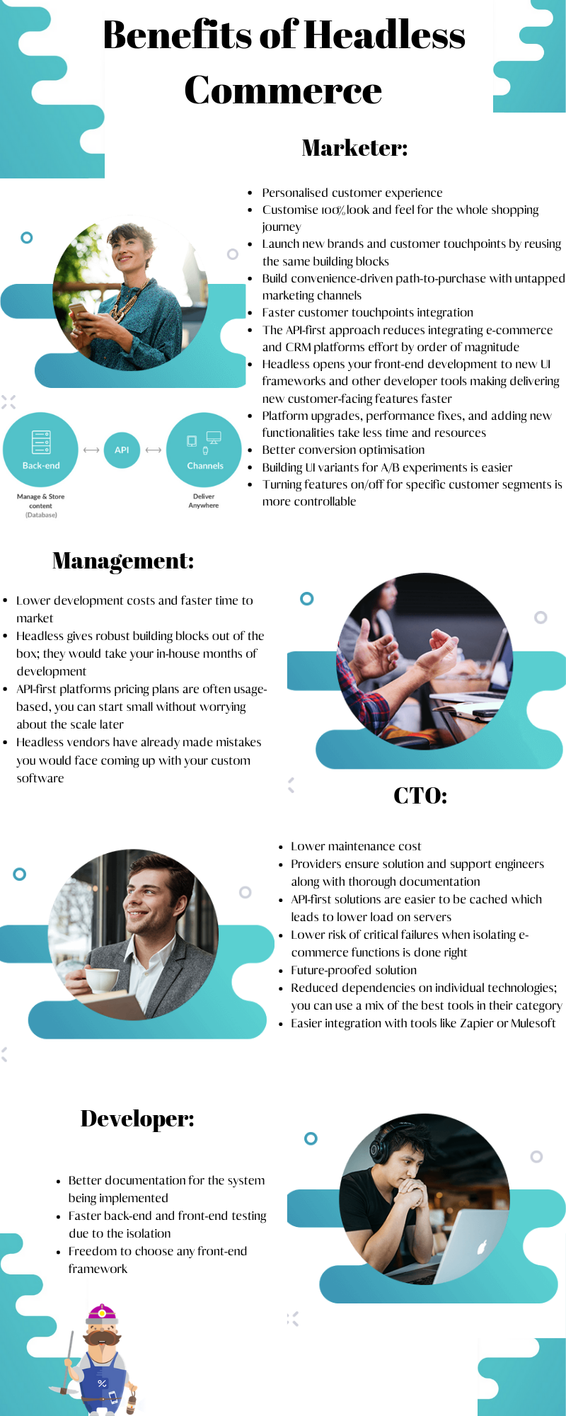 به لطف جدایی ، توسعه دهندگان شما ، هم از پشت و هم از جلو ، از ابزارهای توسعه بهتری بهره می گیرند و از این طریق می توانند با سرعت بیشتری در ادغام با بخش های مختلف نرم افزار تجارت الکترونیکی دست یابند.