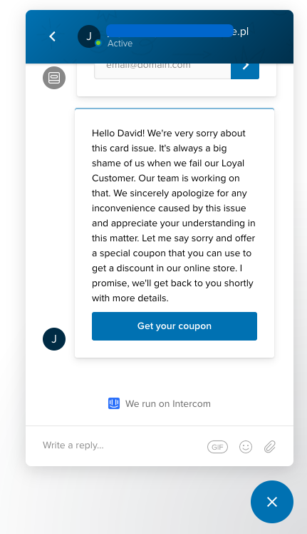 برای این کار ، Voucherify برنامه ویژه ای را برای Intercom منتشر کرد ، که به شما امکان می دهد یک کوپن "متاسفم" را مستقیماً از پنجره مسنجر شروع کنید تا شروع به بهبودی کنید. تجربه منفی مشتری فوراً. در نهایت ، بیشتر مشتریان خطاهای شما را می بخشند ، اما بعید است با صبر و حوصله منتظر بمانید تا متوجه آنها شوید و پاسخ دهید. پاسخ سریع باید اولویت اول در مورد هر گونه شکایت مشتری باشد.