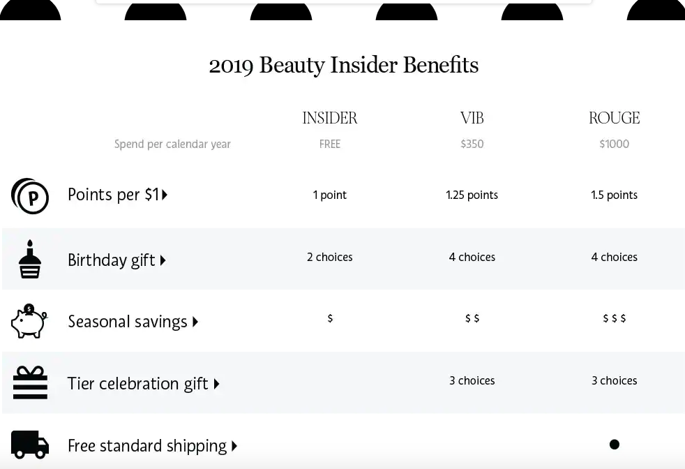 قابل توجه ترین عناصر برنامه Sephora gamification است – این برنامه به سه طبقه (خودی ، خودی بسیار مهم زیبایی و روژ) تقسیم می شود. هر ردیف براساس مبلغی است که مشتری هر سال تقویم را برای کالاهای سپهر صرف می کند ، بنابراین برای رسیدن به وضعیت VIB مشتری باید 350 دلار خرج کند و به وضعیت روژ برسد – 1000 دلار. هر لایه معاملات ، پاداش و انگیزه خاصی را ارائه می دهد ، به عنوان مثال وضعیت روژ حمل و نقل رایگان 2 روزه را ارائه می دهد. هر وضعیت برای هر دلاری که خرج می کنید امتیاز بیشتری به شما می دهد: