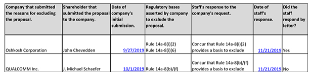 در طول 2018-2019 در فصل پراکسی ، کارکنان به هیچ وجه درخواستی مبنی بر تکیه بر اصل 14a-8 (i) (3) به عنوان مبنای رد یک پیشنهاد ندادند. در طی آن فصل ، 23 درخواست چنین درخواستی را رد كردند.