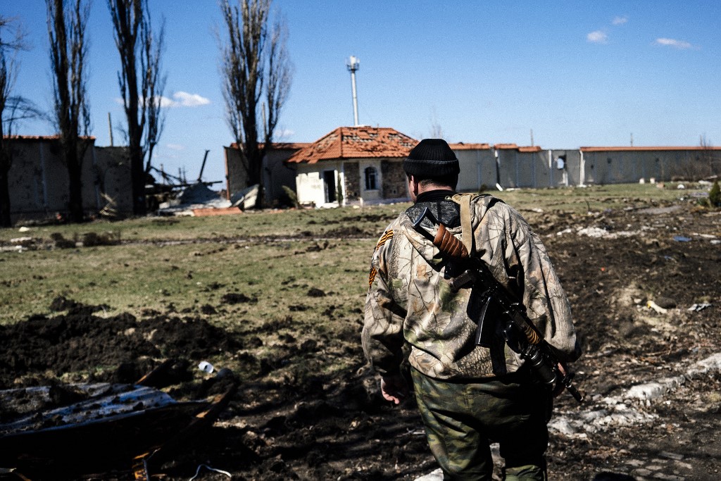 یک جدایی طلب مسلح طرفدار روسیه در 10 آوریل 2015 در روستای اسپارتاک در نزدیکی فرودگاه دونتسک ، شرق اوکراین ، نگهبان است.